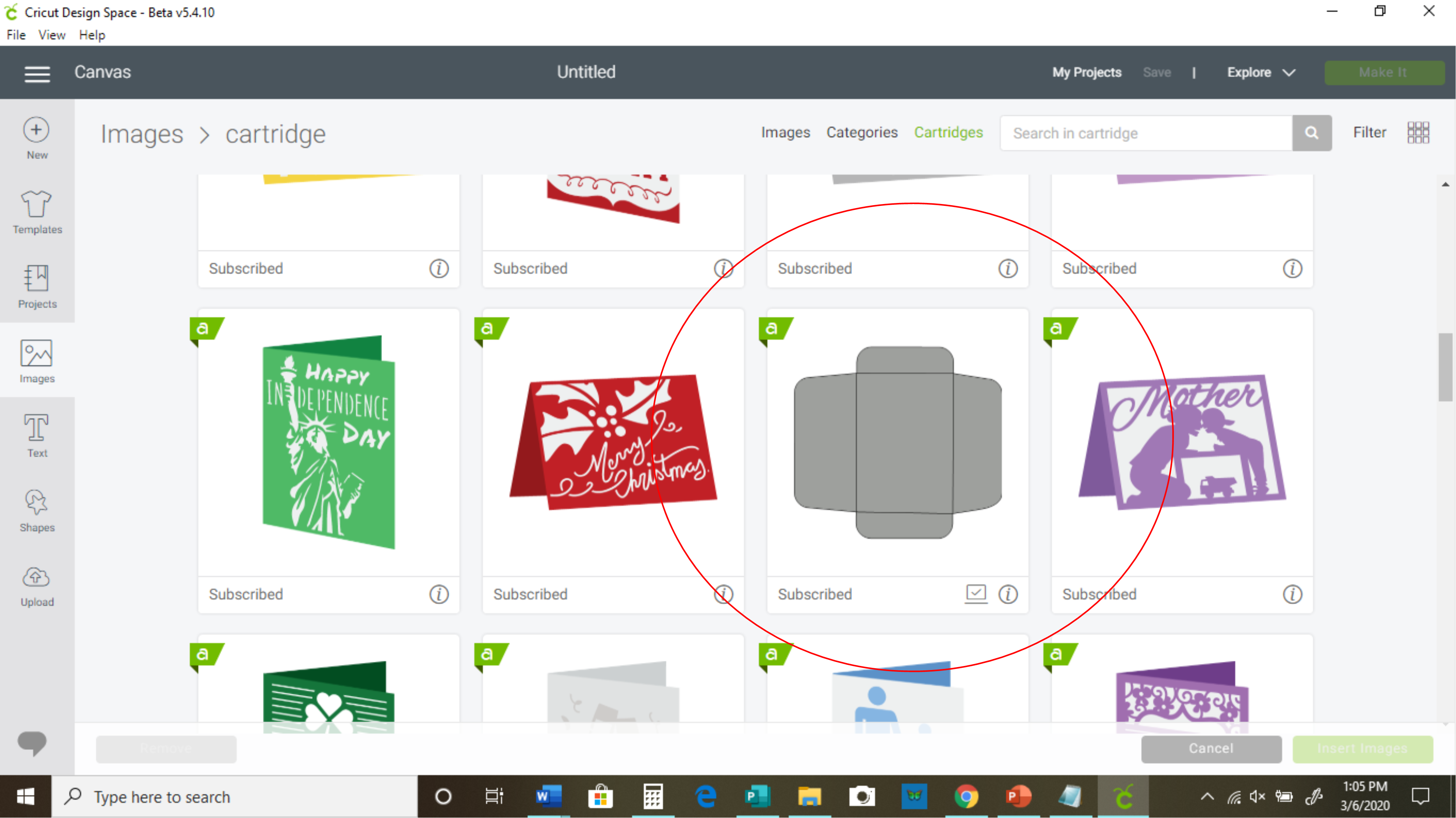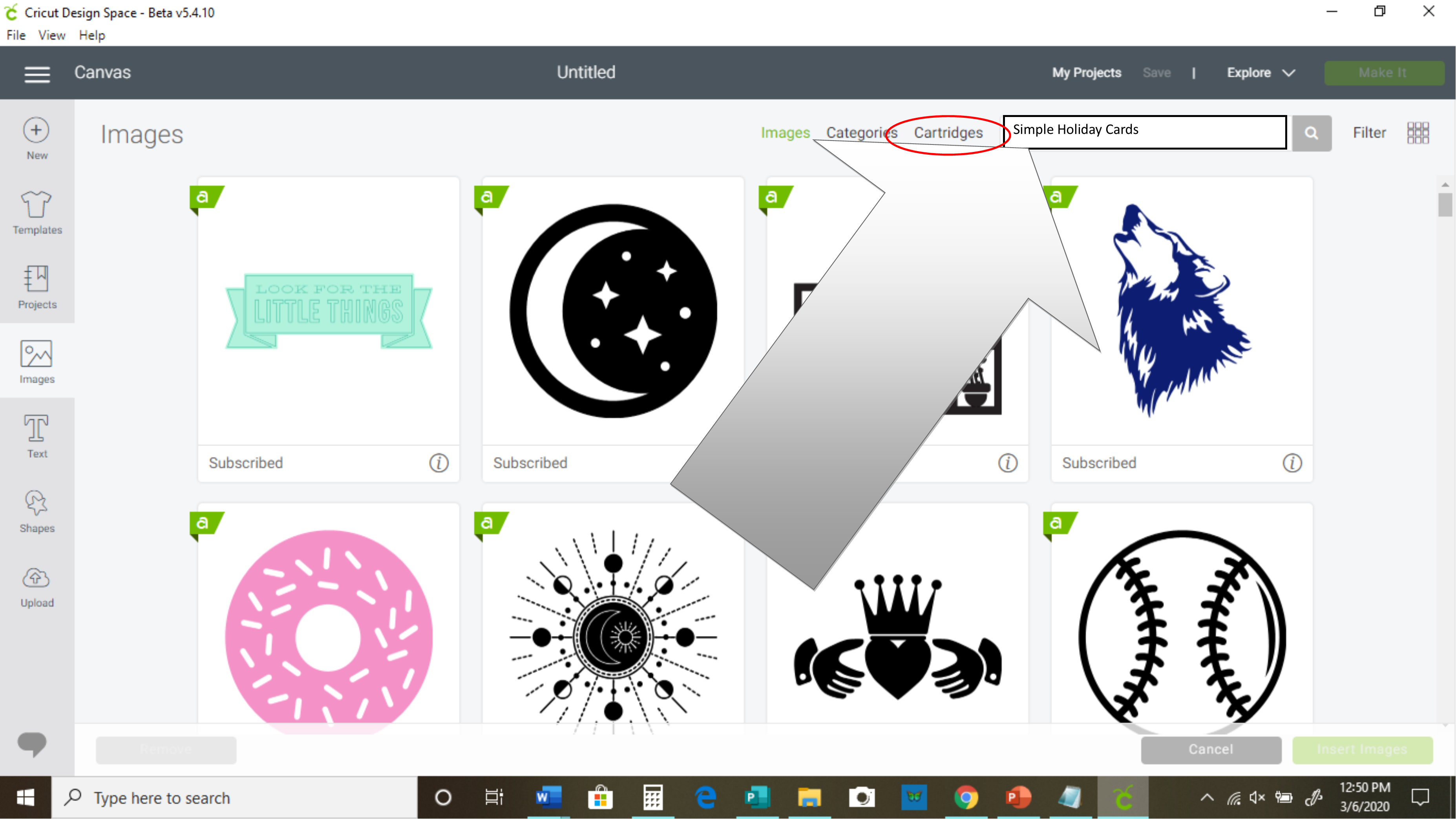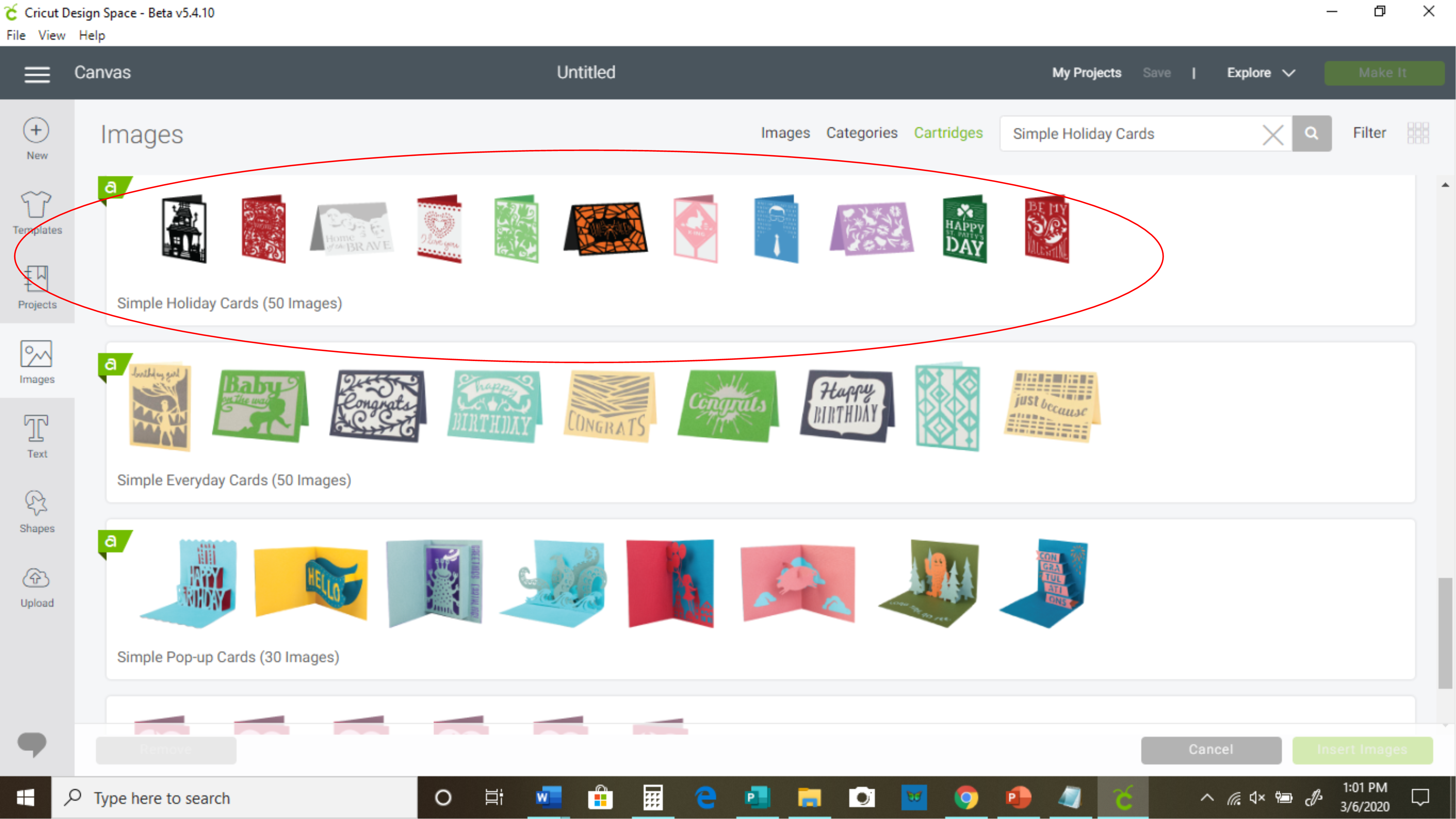 - After clicking on "Images," you will see a bunch of images, and at the top right, you will see a search bar. Beside that search bar, you will see the word "cartridges." Click that, then type in "Simple Holiday Cards" in the search bar and press enter.